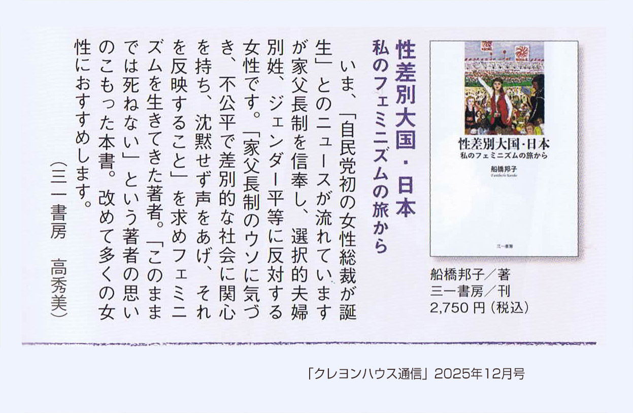 - <「家父長制のウソに気づき、不公平で差別的な社会に関心を持ち、沈黙せず声をあげ、それを反映すること>『クレヨンハウス通信』2025年12月号