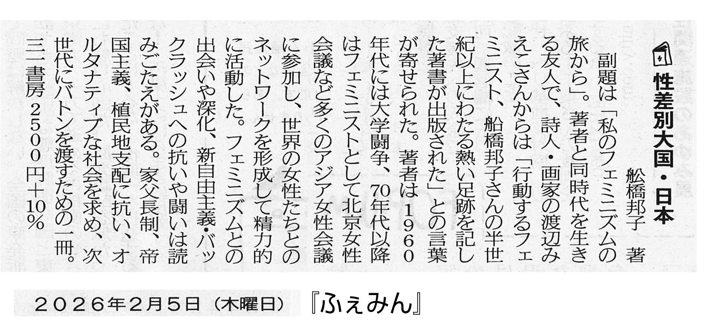 - <家父長制、帝国主義、植民地支配に抗い、オルタナティブな社会を次世代に>『ふぇみん』2026年2月5日
